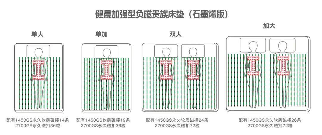 贵族床垫二代负磁更直观,100%负磁全覆盖:健晨复合健康加强型负磁贵族床垫(石墨烯版)二代由原来的工字磁扣+磁条,升级为可视化负磁扣,颗颗分明,粒粒健康,100%负磁全覆盖。